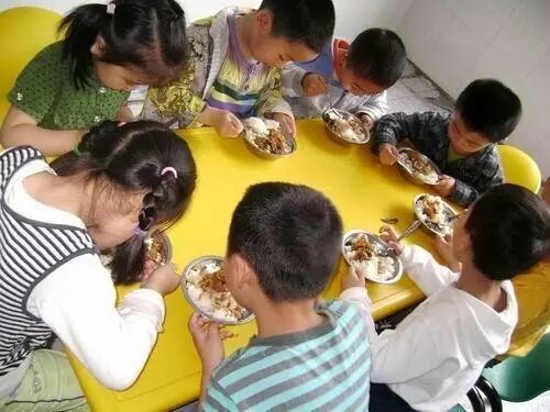 中国小朋友一般都在幼儿园统一用餐。
