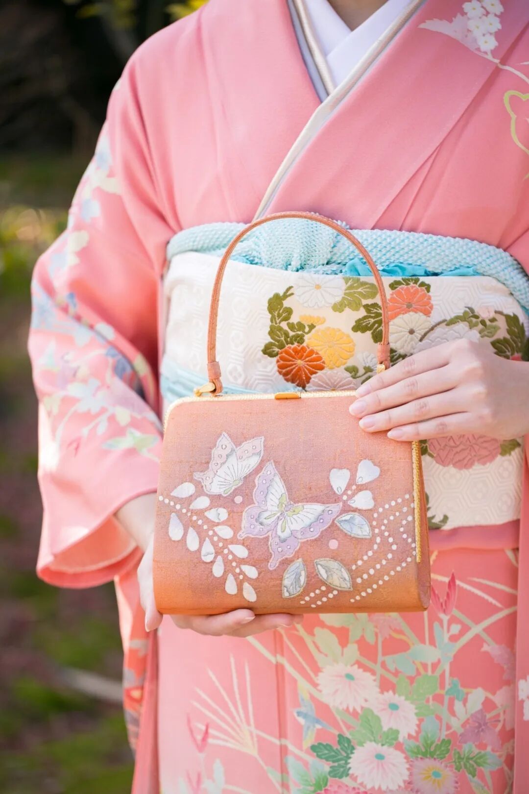 虽然配饰只占一整套和服很小的比例,但它所起到的点缀作用也是不容忽视的,其实主要是3个要素:腰带、发饰、包包。尤其是系在腰间的腰带,作为整套和服的视觉焦点,可谓是传递整套和服美感至关重要的部分。
