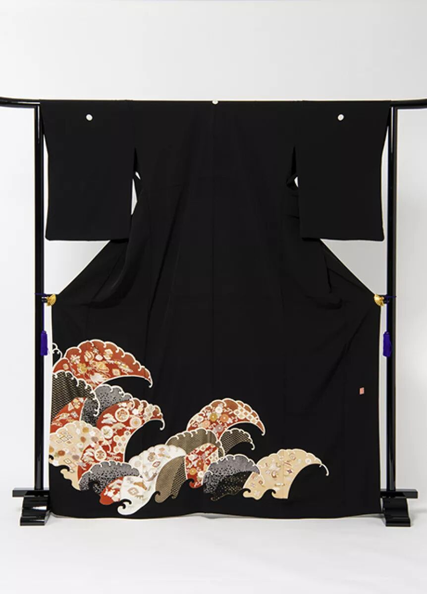 它以黑色为底色,下摆部分的图案装饰是一幅完整的画,在后背、后双肩、前双肩共计有五个家纹,通常是结婚典礼上新郎新娘的母亲、亲戚所穿。