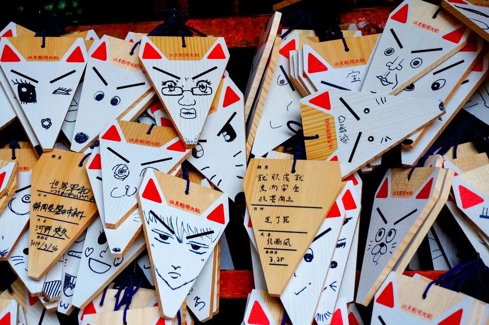 先来看看大家都熟悉的神社——京都的伏见稻荷大社的狐狸绘马吧。狐狸绘马虽然也是五边形,但是被演化成了狐狸脸的样子,而正面的图案是只有细长眼睛的狐狸脸和一对耳朵。那么除了造型还有什么特别的呢?