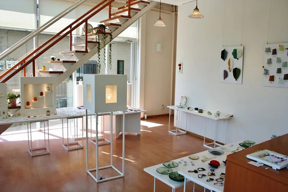 工房位于一幢二层的小楼中,一楼为展览空间及卖店,收集了花器、食器、灯饰、饰品等各种风格的玻璃制品,大多为日本时下最活跃的玻璃职人的最新作品,以前所未见的形态与色彩出现,带给人们一种美的享受。