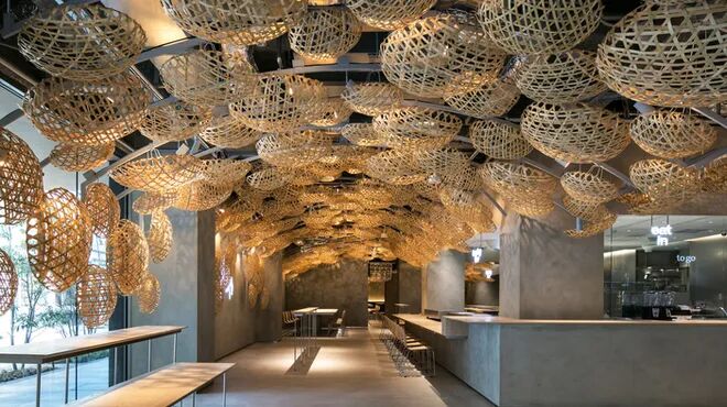 由建筑大师隈研吾设计的这家店,本身就具有高颜值,亮点是天花板上的572个竹筐,装饰出不一样的和风空间,据说全部采用了岚山的竹子并使用了传统工艺制作,非常有寓意。