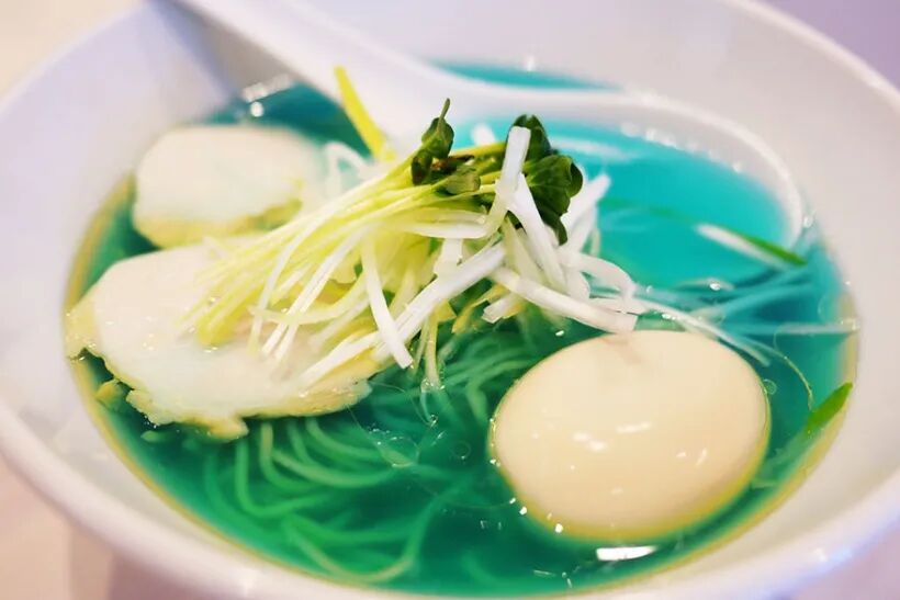 作为人类,与生俱来的是,我们知道有些颜色并不是食物的颜色,比如说青色。一般青色的液体在电影里都是用来吓唬观众的。尤其在全是白色的面、鸡肉和鸡蛋的映衬下,那青色的汤散发着令人窒息的不安感。