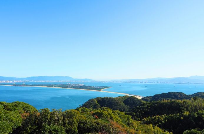 在福冈市东区的志贺岛的潮见公园,在志贺岛差不多最中心的地方,可以同时眺望玄界滩和博多湾,再远甚至还能看到福冈市街地的地方。中间还有海波和行驶的船只。一种静谧又动态的美。