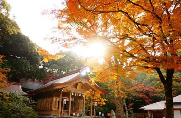 灶门神社(Kamadojinjya)是位于作为众神所宿之山而被崇拜的宝满山(Homanzan)山麓的姻缘神社。在红叶观赏时期,银杏和枫树等,约有300株树木披上了美丽的色彩。