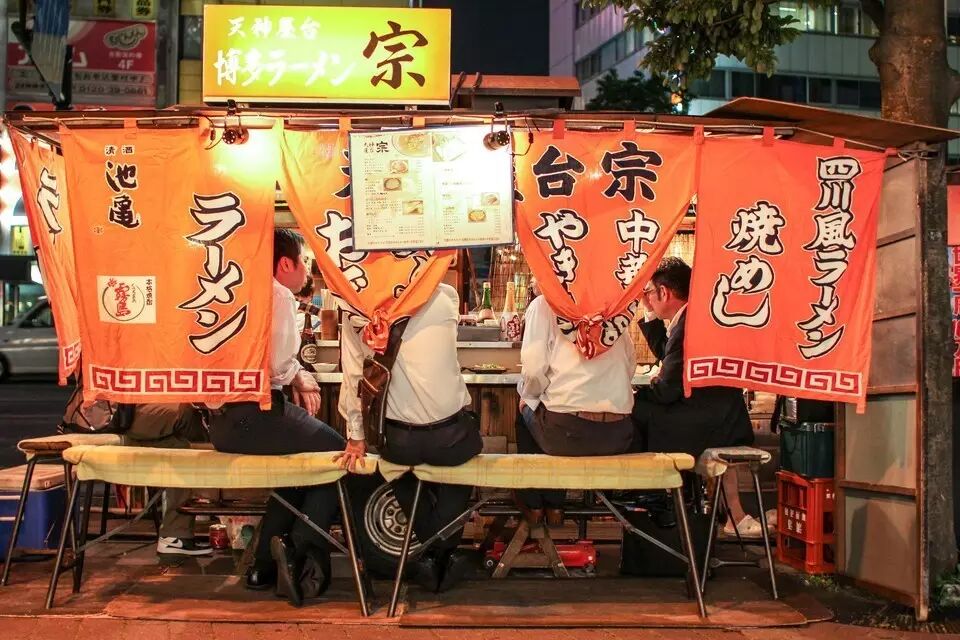 屋台上卖的大多是些小吃,最多的是拉面——猪骨拉面可是博多(福冈的一个区域)的招牌产品,味道浓郁有点咸,也有煎饺、关东煮、烧烤一类,通常从七八点一直开到深夜两三点。可以把它当成清简的晚餐,也可以把它作为吃喝玩乐后的夜宵地,当然更是近距离接触当地人的最好方式。虽然环境窄小,但日式的整洁干净被保持得很好,食材放置得整整齐齐,老板一如既往地眼里有活,手脚麻利。所有的小吃谈不上绝顶惊艳,但每一样都美味可口,最主要的是,里头有浓浓的人情味。