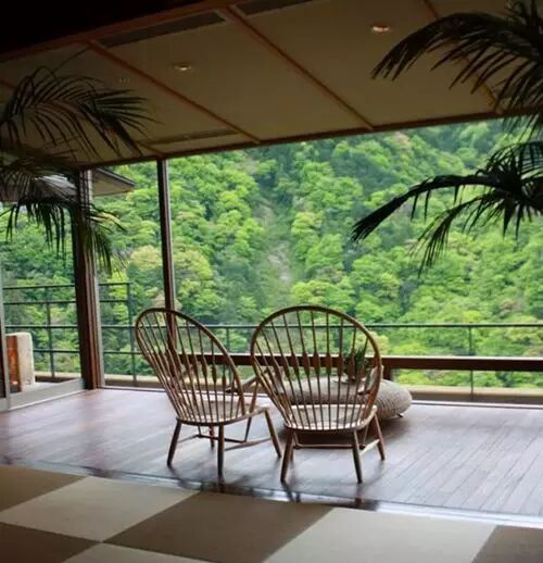 旅馆是一座日式木质的庭院,应该是古代地主的宅邸吧。宅子靠着山,满目的郁郁葱葱。在你预约入住提前时间段里,服务生已经开始在路口等你了。到了前台,经理率队出场,鞠躬致意,但是大家都很轻声,仿佛不愿破坏这山里的宁静。登记时候会带你去酒吧,有人伺候你欢迎饮料和点心。然后管家带你进房。这里的管家都是女子,和服,梳头,都非常漂亮,非常温柔。这里是真正的私人管家待遇,你一切的起居,包括衣食住行,都由她负责。