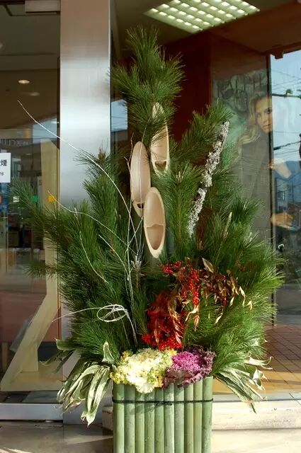 除夕之前大门口搭建松枝门(「門松」かどまつ或者「松飾り」まつかざり)。门松是为岁神降临做的路标。
