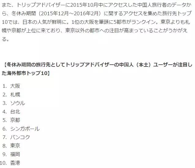 日本相关报道称中国人海外旅游前10名,日本占了5个城市。其中大阪最人气,东京排名第8名,而福冈紧随其后排名第9哦。
