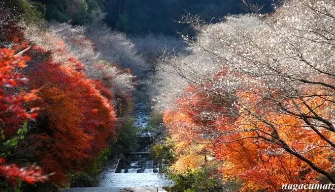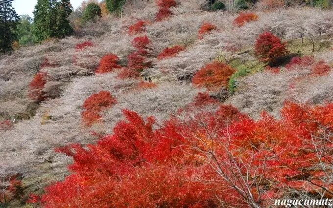 紅葉の時期と重なる秋の桜が特に幻想的で、紅葉の燃えるような赤と桜の淡いピンクのコントラストが美しいです。11月の開花期には「小原四季桜まつり」が開かれます。