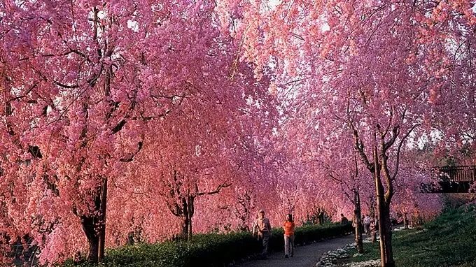 園内には約500本のサクラがあり、ソメイヨシノ、シダレザクラ、ボタンザクラと、約1カ月にわたりサクラのリレーを見ることができ、なかでもシダレザクラのトンネルは見事です。