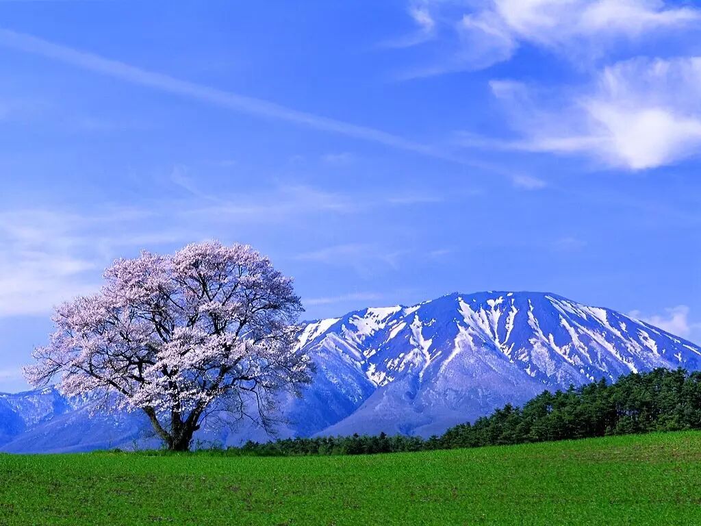 残雪の秀峰岩手山と緑豊かな牧草地、色鮮やかな桜とのコントラストは、農場ならではの景観で見応え十分。小岩井農場の一本桜はまきば園から約1.5kmの牧草地にあり、NHK連続テレビ小説「どんど晴れ」で有名になった。