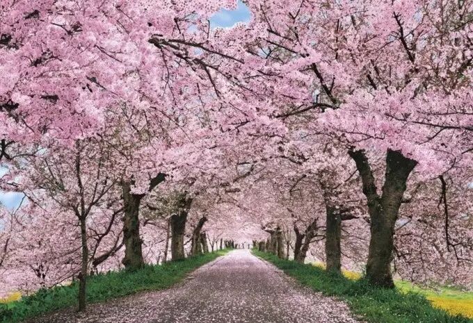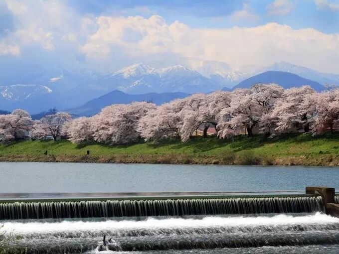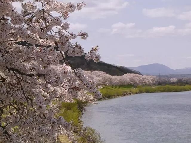 大河原町から柴田町にかけての白石川堤を彩る桜のトンネルで、ソメイヨシノをはじめ約1200本の桜並木が8kmにわたって続く眺めは圧巻。残雪の蔵王連峰が背後に広がる景観も見事。
