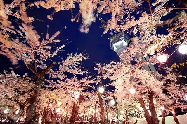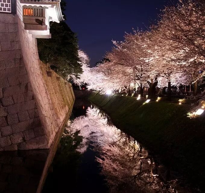 高田城三重櫓のライトアップとボンボリに照らされた約4000本の桜が、お堀の水面に幻想的な風景を映し出す。