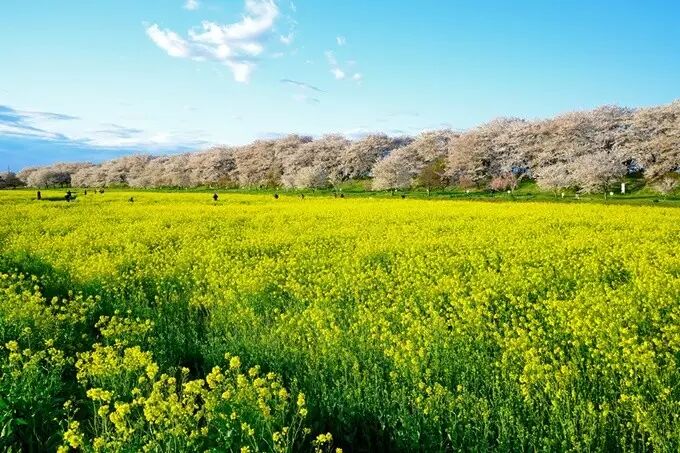 春を迎えると長さ1㎞にわたる堤に約1000本のソメイヨシノが咲き誇り桜のトンネルを作ります。また、堤の隣には、菜の花が作付けされ、桜の淡いピンクと菜の花の黄色とのコントラストが見事です。