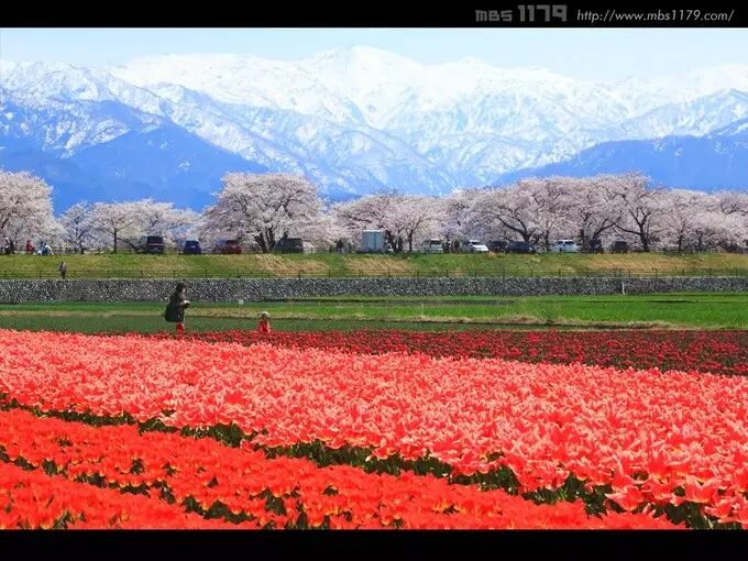 桜の手前にはチューリップや菜の花といった季節の花々も咲き、これ以上ないくらいの見事な景観となります。