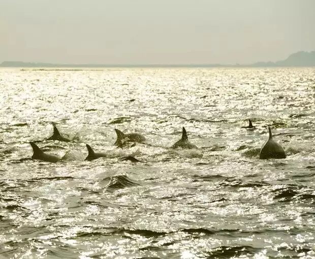 眼前那清澈的海水中突然掠过几道影子。“出现了!”同船的人惊呼道。只见三五成群的海豚已近在咫尺,有的翻滚着圆滚滚的身躯,有的则一上一下微微跳跃。这一群刚刚走远,又游来新的一群。阳光下,海豚们的背脊闪闪发亮,引人神往。