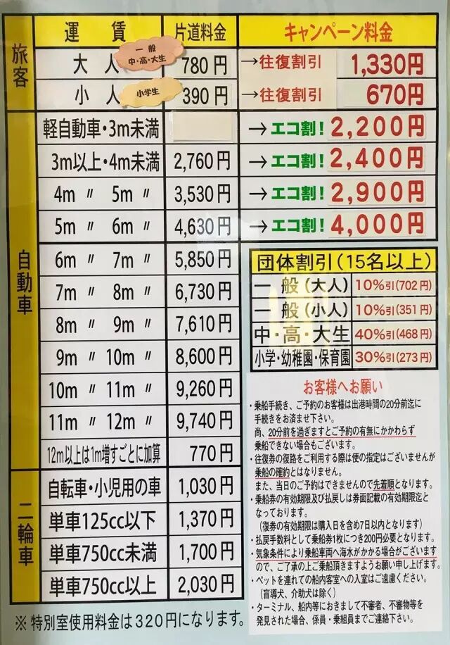 *在长崎岛原&熊本之间,可以乘坐渡轮往返,渡轮的费用和时间如下图: