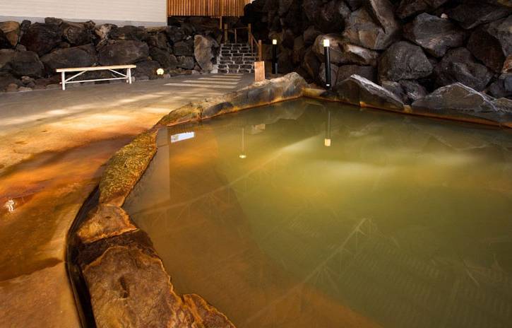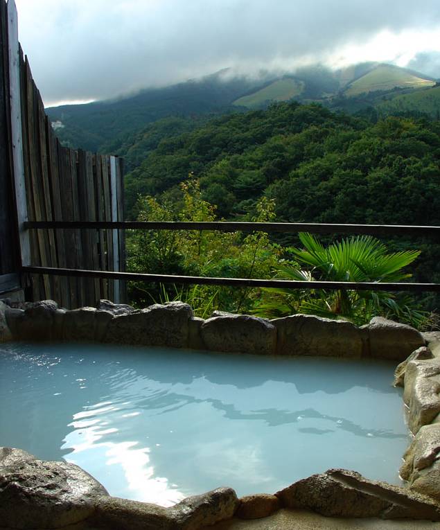 お湯の特徴 : 源泉掛け流し。ミルキーブルーに濁り、とろりとした湯ざわり。よく温まる