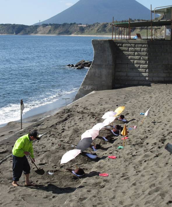 在这里还可以享受指宿最有名的被埋在沙子里的服务。温热的沙子可以去除身体的寒气。