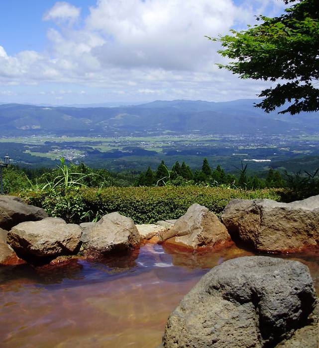 白天看上去感觉虽然稍微逊色了点,但是也能看到周围的村庄高楼和远处的雾岛。这个温泉是地下1000m出来的对皮肤非常好的炭酸水素塩泉,深得女孩子喜欢。
