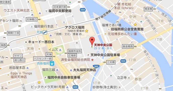 天神出发步行约15分钟。乘坐西铁巴士的时候,从天神开往博多阜头方向的90号巴士的终点下车。