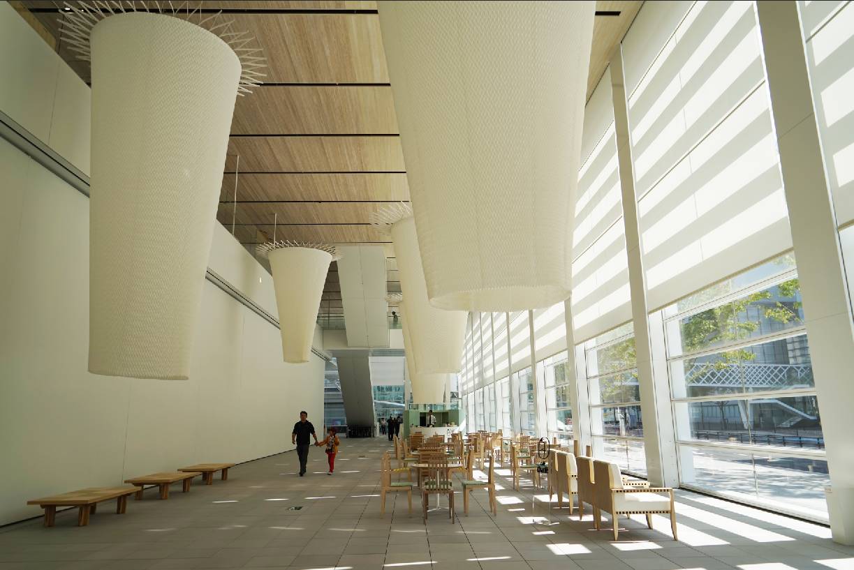 坂茂先生一贯主张简约的建筑风格,这次美术馆设计,在一二层开设了宽敞的中庭,咖啡厅和休憩空间。大面积的玻璃窗联通室内外,对行人不造成压迫感,增加了市民的参与度。