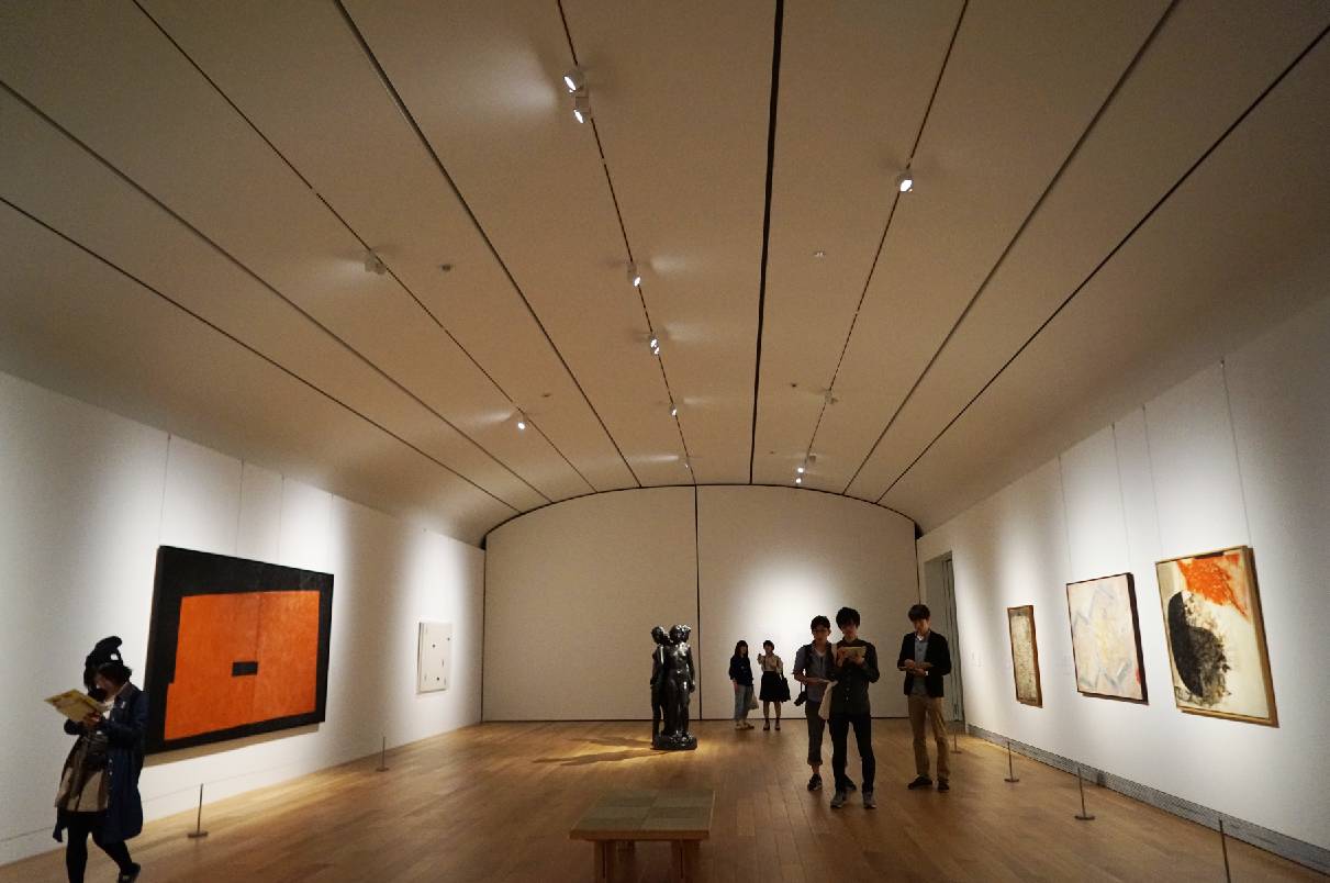 位于三楼的展厅中展示着来自各地艺术家的绘画和雕刻作品。值得一提的是,天花板上的缝隙其实是空调的出风口和进风口,使展厅受风均匀,一直处于舒适的温度状态。