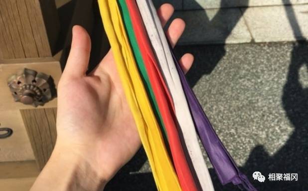 总共有五个颜色的绳子。为什么是这五个颜色呢?据说是释迦牟尼佛在濒临死亡瞬间,参透佛理而灵光乍现的光芒颜色。