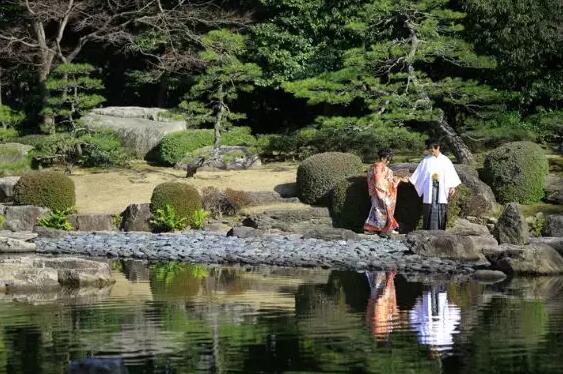 邻接福冈的绿洲•大濠公园的大濠公园日本庭园。是由日本庭园传统的庭园技术的古典美 ,加进近代性制造的,假山林泉周游式的庭园。 园内配置着,大池和假山的大池泉庭园,曲水的流动,枯山水庭园,茶室构造的茶室和露地庭园等,根据维系 这个的通道,可周游。 夏天的深绿,秋天的红叶,冬天的松之绿等,一年四季能欣赏到的自然美。
