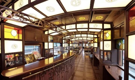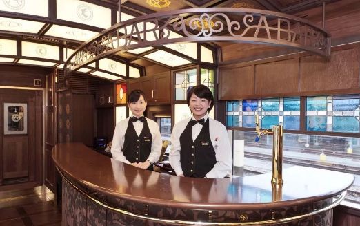 一号车厢内有最受欢迎的A-TRAIN BAR酒吧柜台,格子形的天花板上,金箔徽标熠熠生辉,吧台上蔓延着树叶图案,配上丝绒长凳和沙发,以及服饰整洁的调酒师为你调制的特色威士忌,向谷实氏编曲的爵士名曲【坐A列车去吧】在车厢内流淌,将这场“绅士之旅”的奢华优雅体现得淋漓尽致。