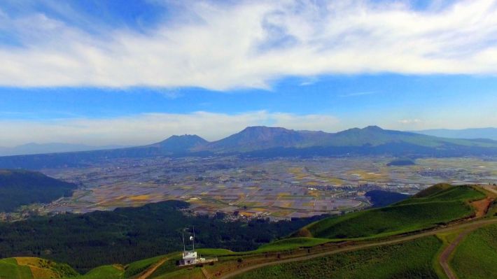 在阿苏大观峰上,可以将阿苏五岳一览无遗,是远眺阿苏五岳的最佳地点,连绵起伏的山丘峰峦叠翠,整个阿苏地区的街景尽收眼底,是观赏红叶胜地之一。