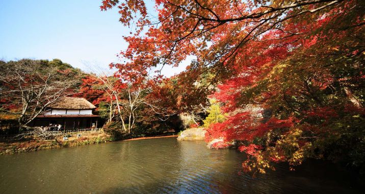 以御船山断崖为背景,宏大的庭园于山下展开,总面积达50万平方米,是著名的红叶胜地;红叶点灯,堪称日本一绝。
