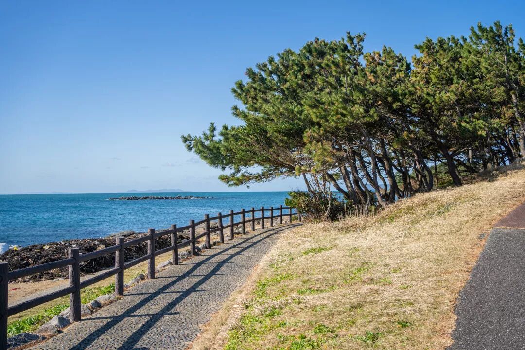 前往镜山的途中,会经过一片绵延5公里海岸线的百万松林的虹之松原,松林与白色沙滩、蓝色大海相邻,景色美不胜收。
