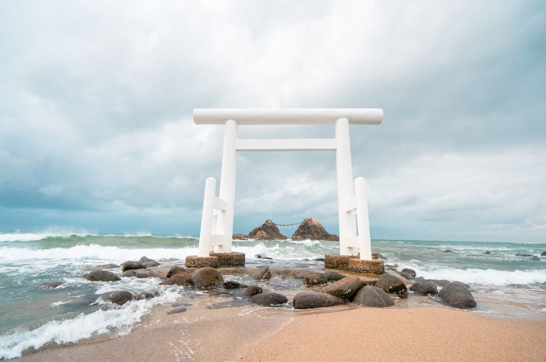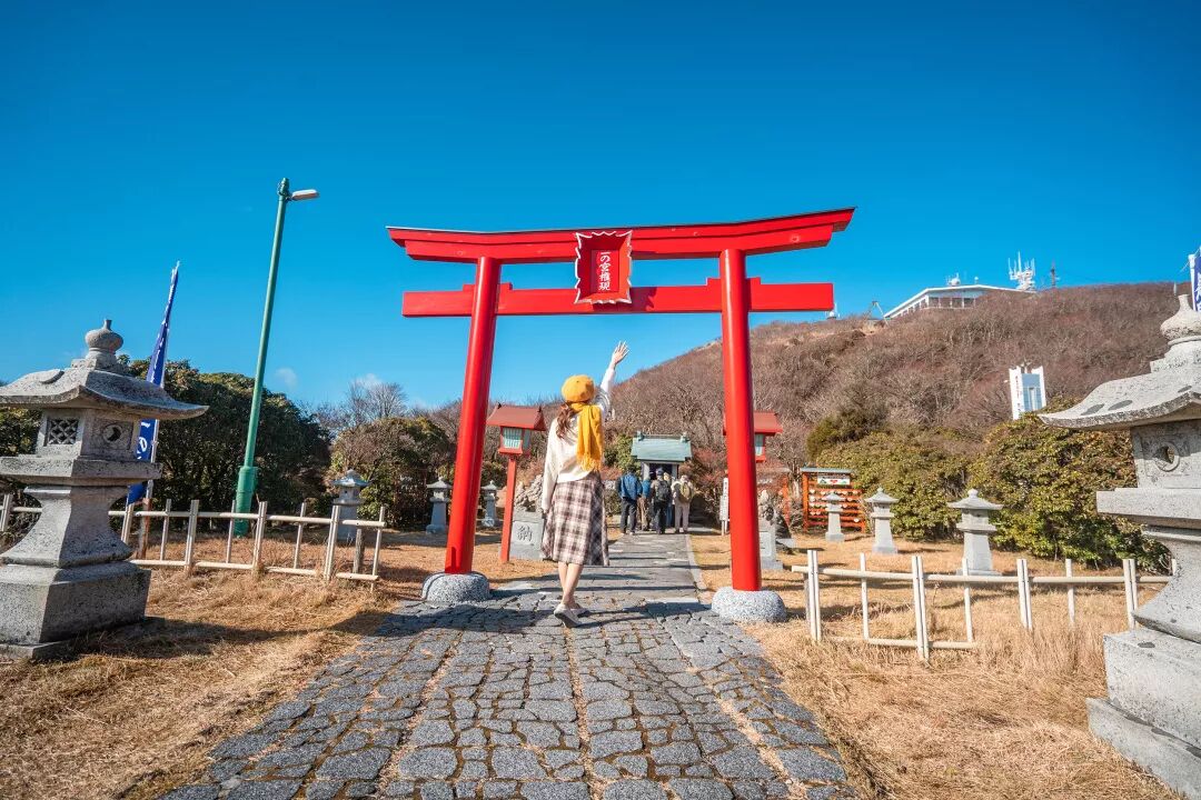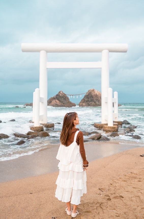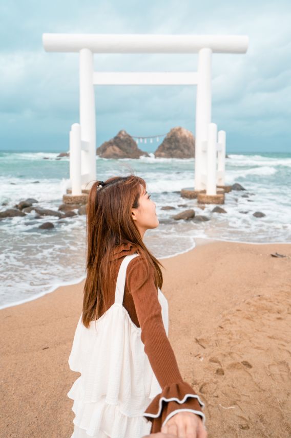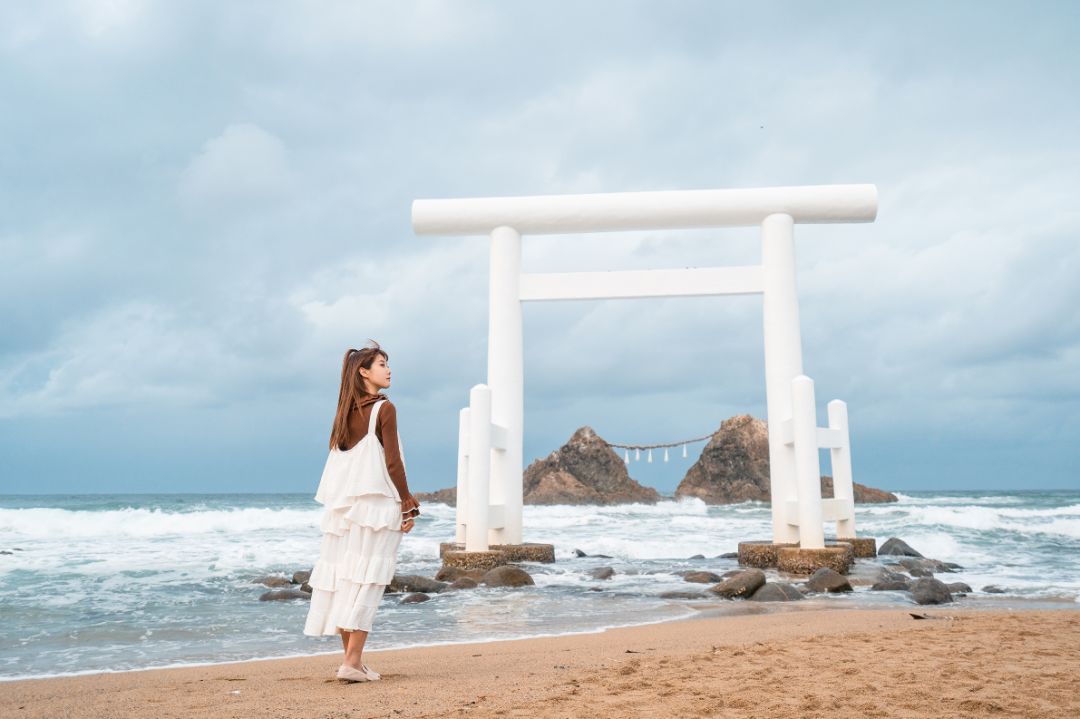 海岸边整齐排列的两块大小高低相仿的海岬被称为“夫妇岩”,伫立在海上的纯白色鸟居,夫妇岩象征了美好的姻缘和夫妇美满,是日本有名的能够加深两人缘分的能量地点。