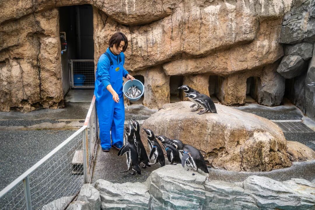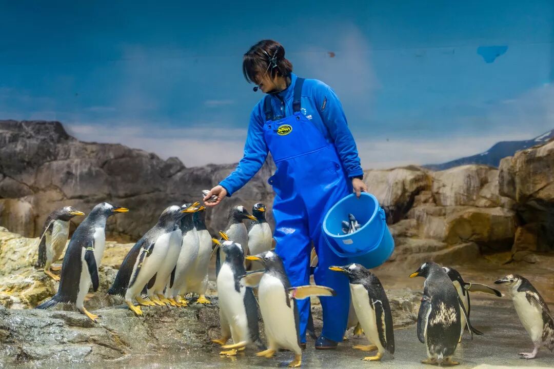在这里每天饲养员都会定时地喂食企鹅,而原本动作缓慢,不急不躁的小企鹅们,就会一下子走得飞快,饲养员走到哪,它们就跟到哪,如若是在水里那更是化身一个个游泳健将。