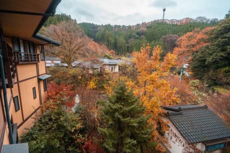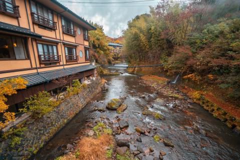 山彦旅馆是沿着河两岸建造的一家老字号旅馆,中间用跨河的木桥长廊连接,几乎每间客房的窗外都能看到黑川的迷人景色。