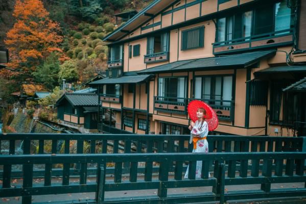 整个黑川温泉的建筑风格都是以传统的日式木质建筑搭配古典明黄色的外观色,与山林里黄绿色的植被构成了一副极美的山城画。