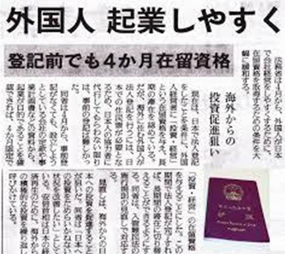 例如,外国人在日本开公司、外国人收购日本的公司、或者外国人通过投资,获得公司的社长 · 取締役 · 支店长 · 部长。可以申请经营管理签证,取得在日本居留的资格。