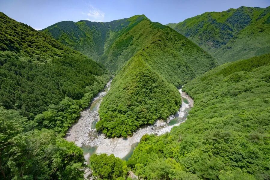 这里的绝美溪谷位于吉野川支流的祖谷川,全长达10km,由于降水量多,树木茂盛,拥有被隔绝的深山幽谷的景观。深深切入V字型的溪谷因其形状而被称为“ひの字溪谷”,秋天从谷底到山峰都是满山红叶,非常漂亮。
