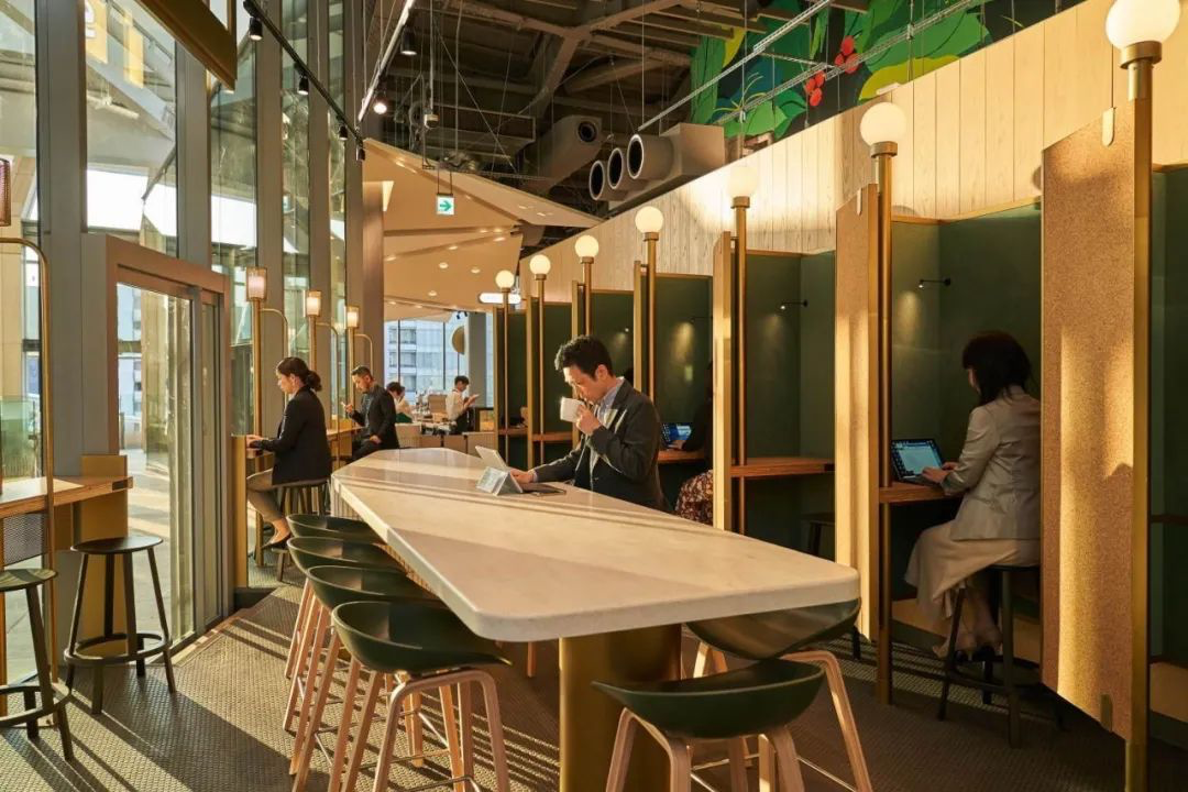 还有专门的单人分隔座位,并附有电源插座,非常适合上班族们点杯咖啡在这里处理一些工作。此外,店内还有容纳多人讨论的长桌以及日本首创的包厢式单人工作间,可以满足上班族们的各种需求。真的是太贴心了啊!