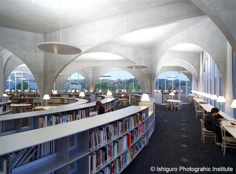 与传统图书馆安静沉稳的形象不同,这座建筑的设计使用了大量的几何形状——众多拱形的门梁设计组合在一起,构成了一座颇有颠覆性、甚至带些二次元感觉的建物,与美术大学的气质倒是颇为相称。 室内设计也令人惊喜,仍旧是使用了大量拱形设计,打破了空间的沉闷感,带来了生动与韵律感,很有一种中世纪欧洲的复古气氛;而拱形的落地窗又巧妙地修饰了窗外风景,在这里漫步,有像逛美术馆欣赏画作般的感觉。