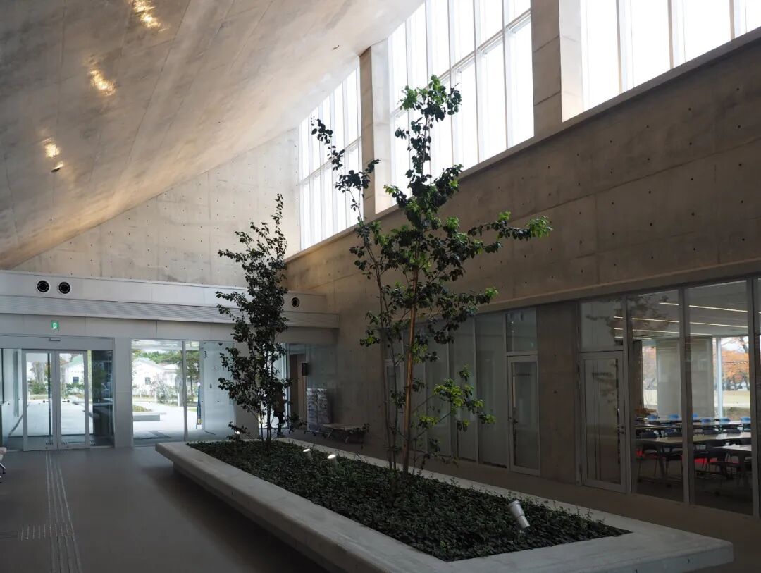 在官厅街通美丽樱树掩映下的具有造型美的长条形混凝土建筑,就是十和田教育PLAZA,熟悉安藤风格的人,一眼就能看出来他的手笔;市民图书馆及教育研修中心就坐落在其中。春天,透过图书馆的玻璃窗就可以看到街头的樱花,取景恰到好处。