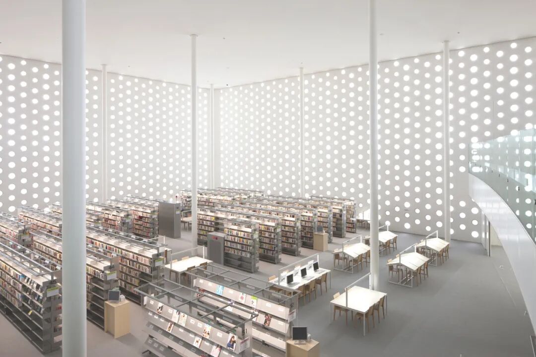 走近图书馆,才会发现“气泡”原来是墙壁上的圆窗,不仅为其巧思妙想而拍手叫好;圆窗达6000个之多,不仅成为外立面的装饰,也对室内的光线调节起着重要作用。