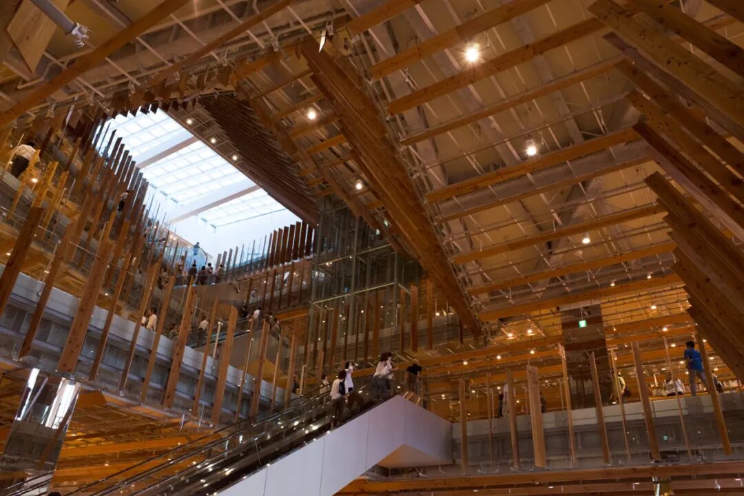 走入建筑之内,又为熟悉的“隈氏手法”所惊叹——大片大片的杉木板平行并列,装饰在天棚之上,有一种漫步于参天丛林之中的感觉。楼顶有块大型玻璃天窗,自然光线从这里投射下来,折射至杉木板及装饰玻璃上,形成一种柔和的光照氛围,很有视觉上的舒适感。