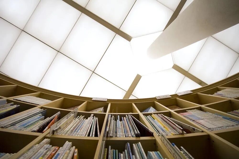 馆中的设计理念是“书与森林”,隈研吾同样使用了当地产的杉木木材,铺陈于天花板及墙壁四壁,天顶上的杉板如波浪状起伏,挑高极高,营造了开阔的空间感,书香与木香混合在一起,带给人无比舒适的阅读体验。