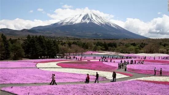 富士山芝樱节的芝樱是面积最大的,大约占地2.4公顷,总共约有80万株,各种彩色的芝樱象绒的地毯一样和富士山的蓝白色遥相呼应,挑战每个人的视觉神经,可以说是一场视觉秀!每年大约从四月十八到五月三十一,就不断有游客来这里庆祝芝樱花的盛开。