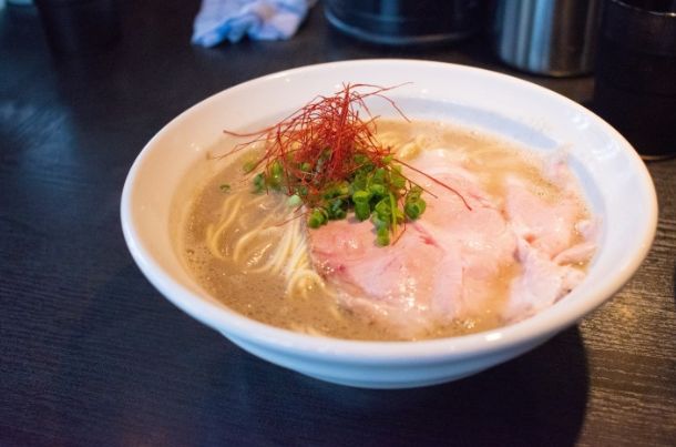 位在街区的转角,看似不起眼的小店丿贯(读作“へちかん”、不是片假名的“ノ”),除了点的小鱼干汤底拉面之外,每天提供不一样的限量菜单,常常在开店时间前就出现排队人潮。 当然面跟汤头十分美味,不过大家都是为了这片粉红色泽的肉片了。 和一般拉面店不同,不用一般的叉烧肉,而是低温调理的猪里肌肉片,鲜嫩多汁的口感成为常客一再造访的理由。