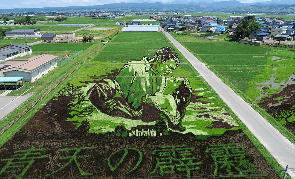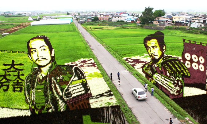 日本青森县田舍馆村,种植水稻的历史已有二千一百年。1993年开始招集城里人到村里来体验插秧活动,并在田里用三种颜色的稻草叶插出文字图案,这就是稻田画的开始。后些年演变成简单的图画,到现在已研究出七种颜色(绿色、黄绿色、深紫色、黄色、白色、橙色、红色)的稻草叶,可细腻的表达出各种图案,形成了稻田艺术。