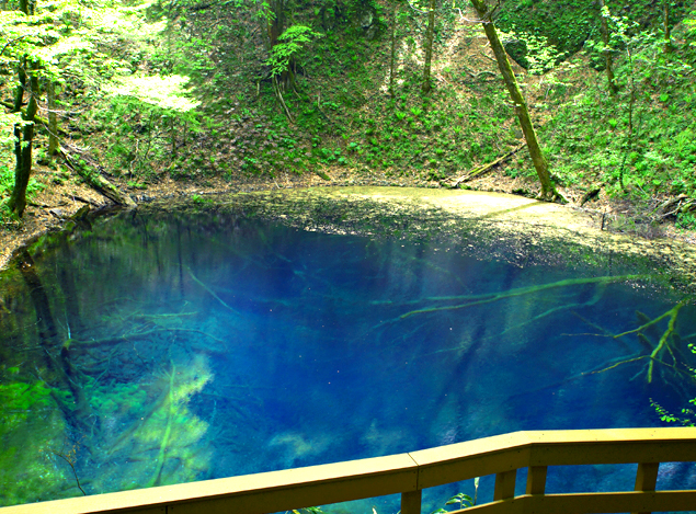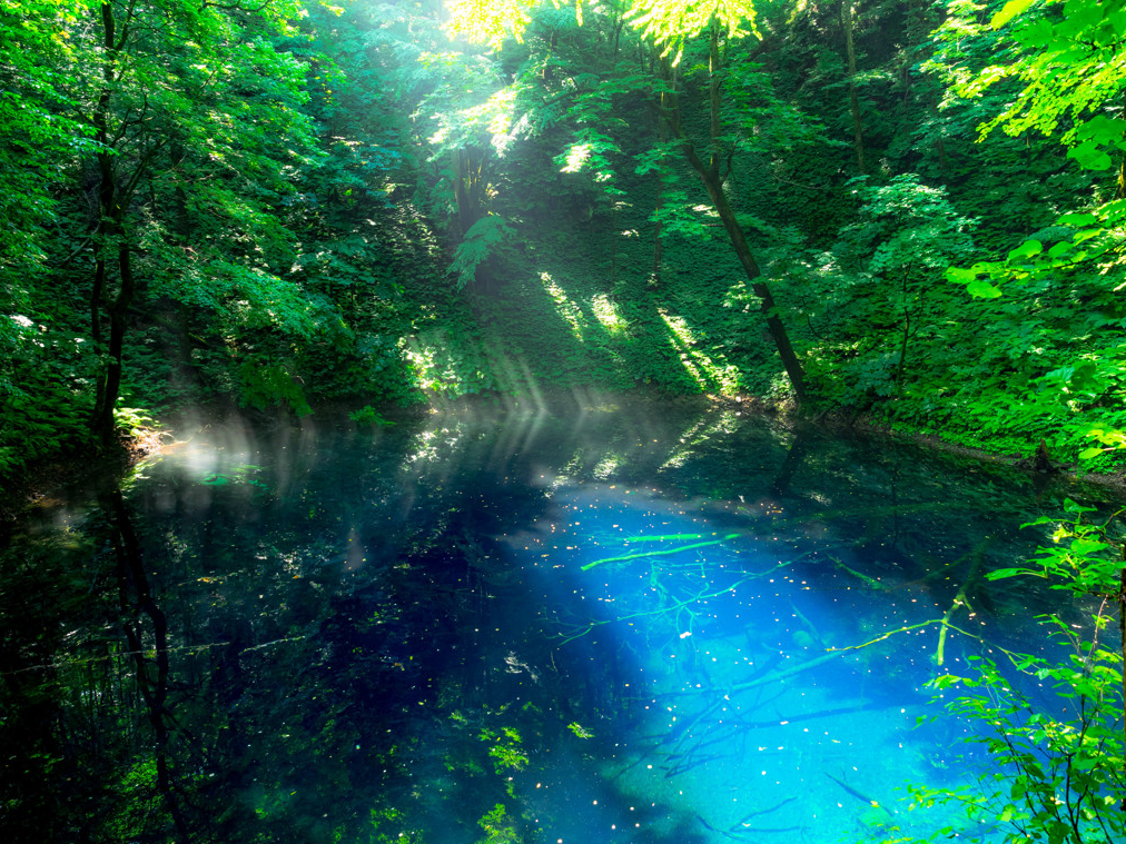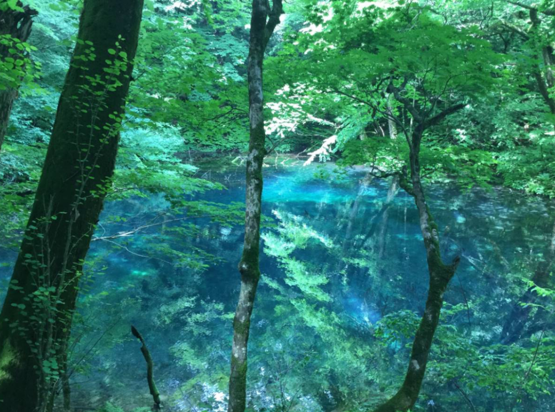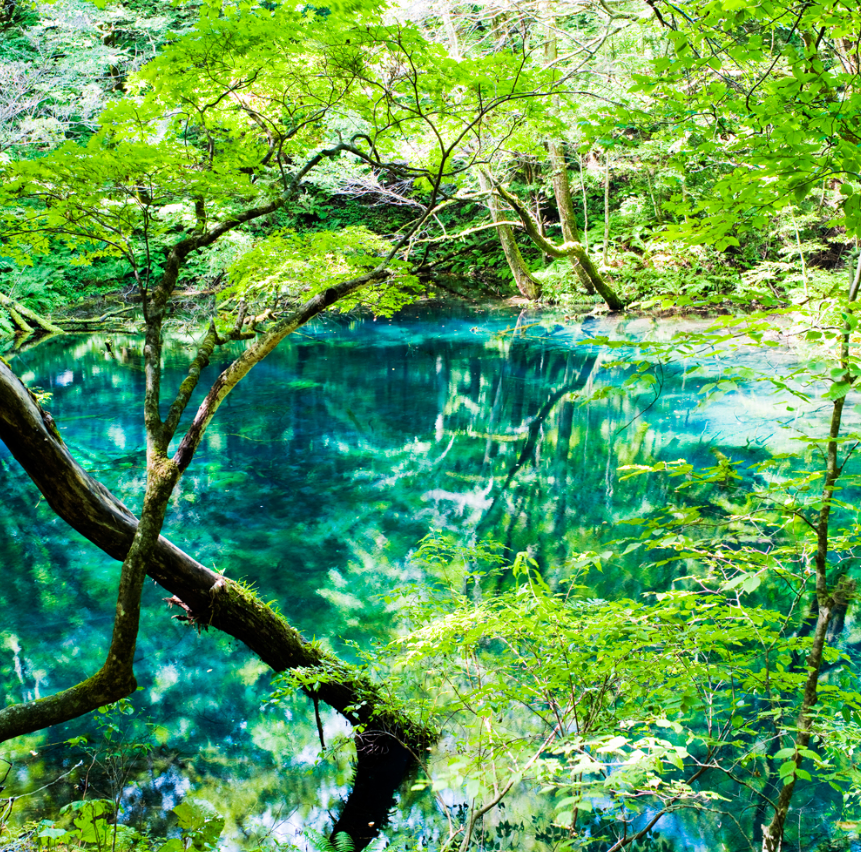 十二湖之中,最为神秘、也最为美丽的是“青池”。青池的面积不大,但湖水却呈现出特别的青蓝色。湖水清澈见底,能直接透过宝石般的湖水看到沉在湖底櫸木枯枝。